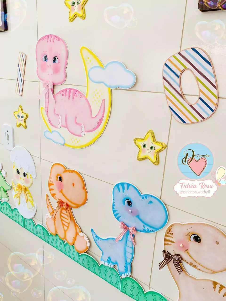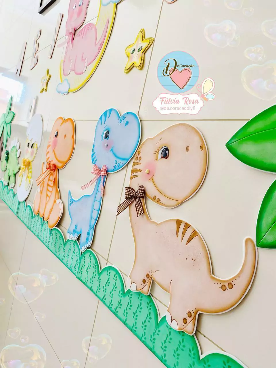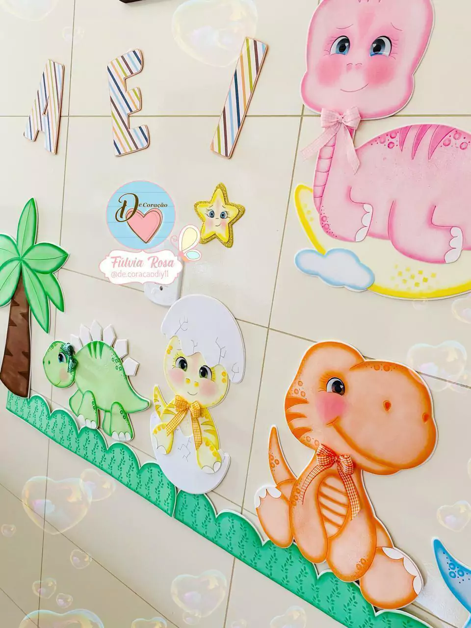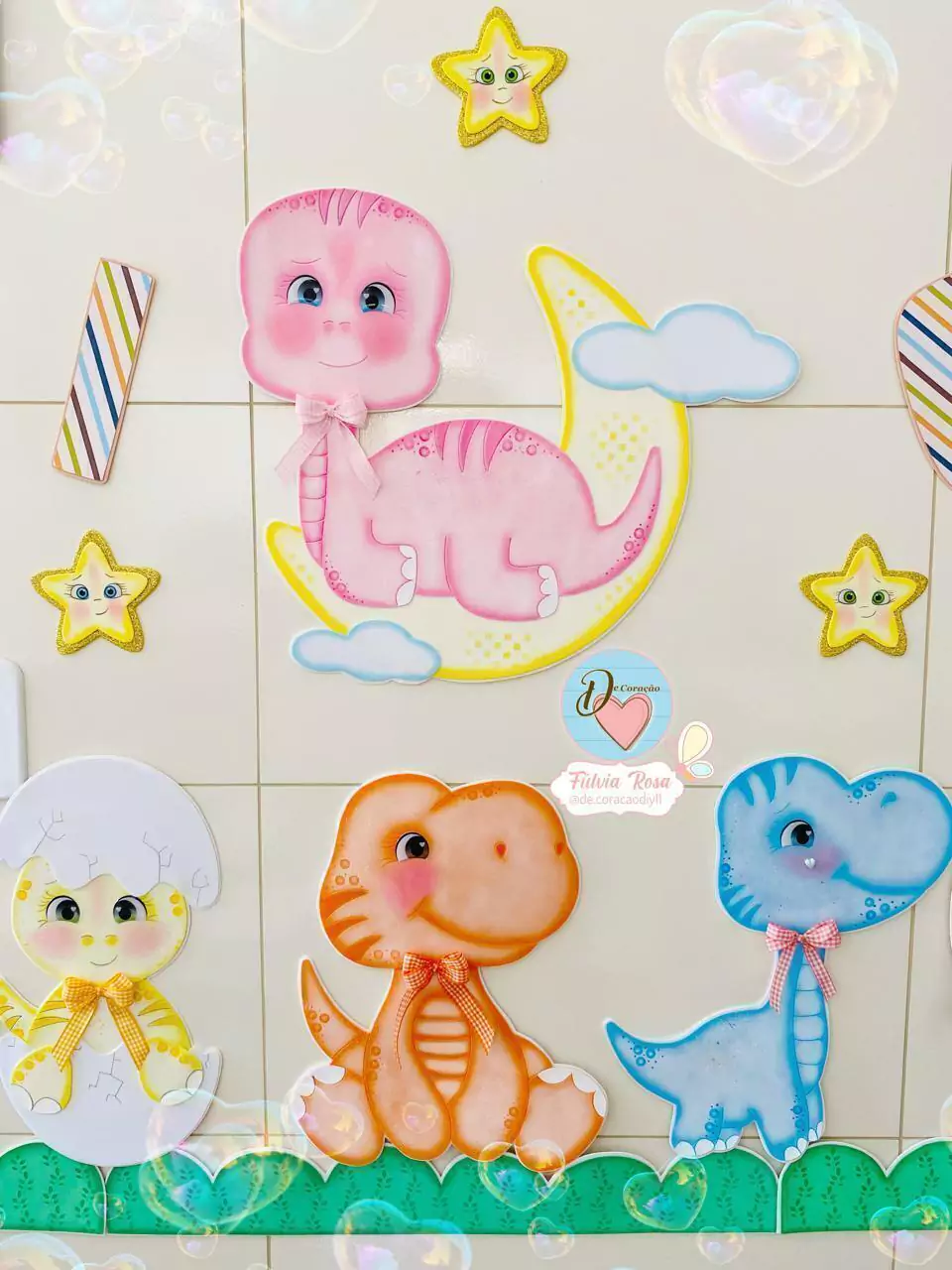 - Contém moldes para a confecção de 6 Dinossauros, coqueiros, estrelas e grama.