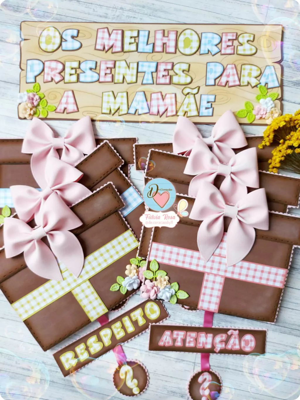 - Medidas aproximadas: Placa Feliz dia das Mães 40x60cm, Placa Os melhores presente para a mamãe 48cmx18cm, presentes 27cmx19cm.