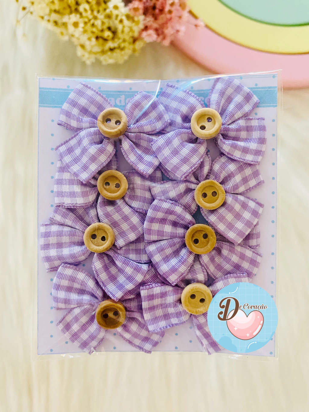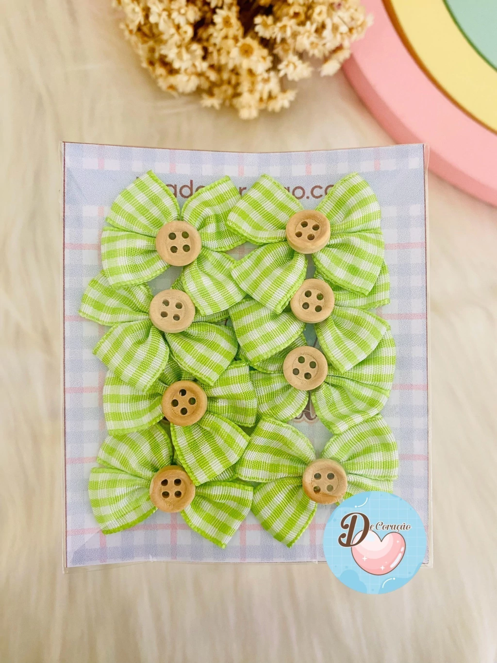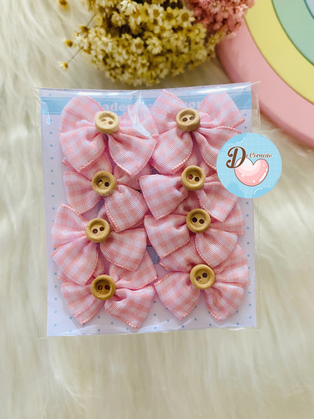 Decore projetos com estilo usando nosso Laços com botões de aproximadamente 4cm de largura! Este kit contém 8 unidades de laços adoráveis, perfeitos para agregar um toque especial às suas criações.