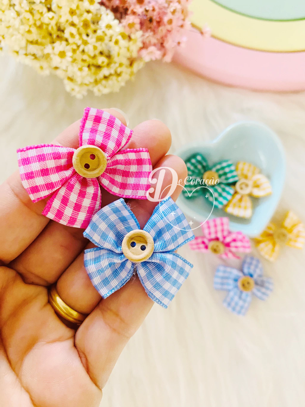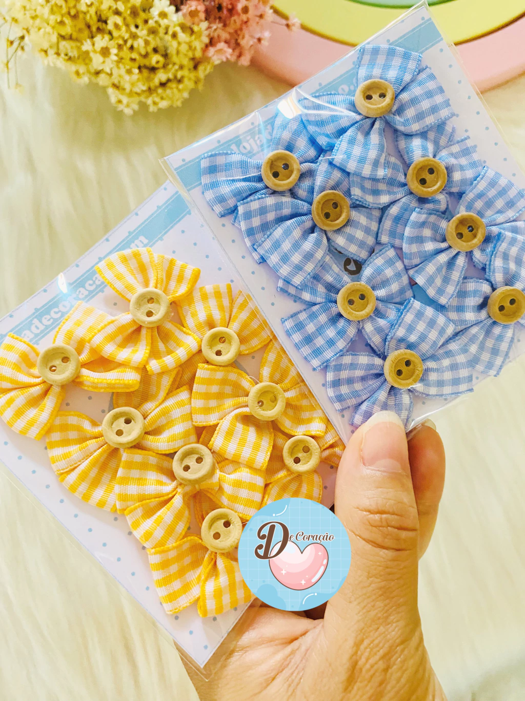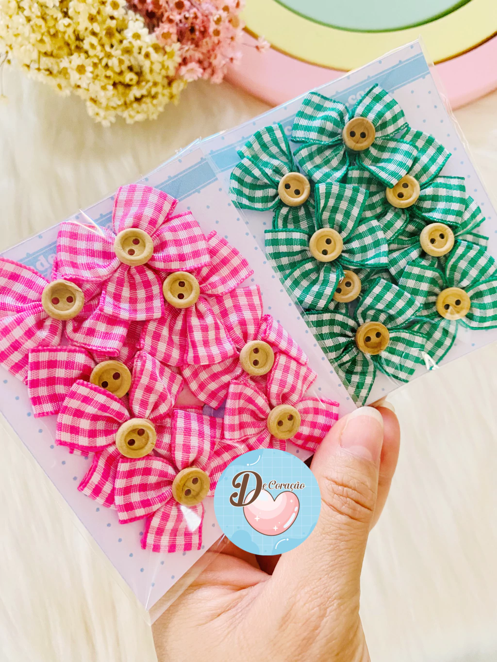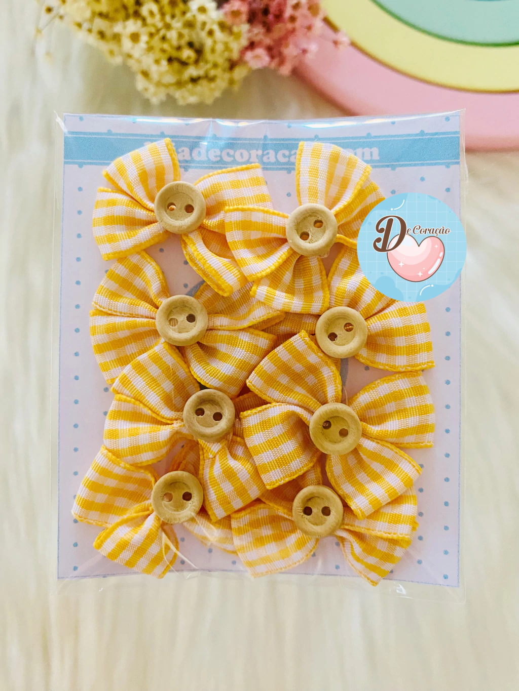 Decore projetos com estilo usando nosso Laços com botões de aproximadamente 4cm de largura! Este kit contém 8 unidades de laços adoráveis, perfeitos para agregar um toque especial às suas criações.